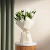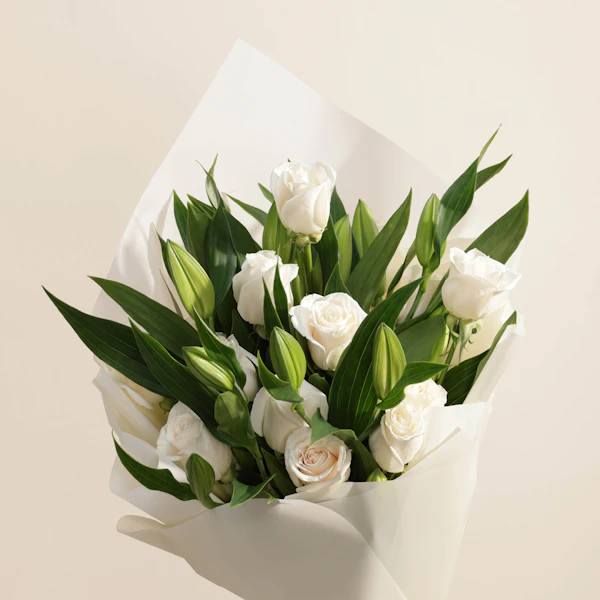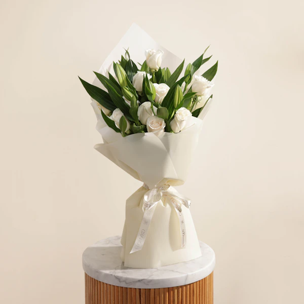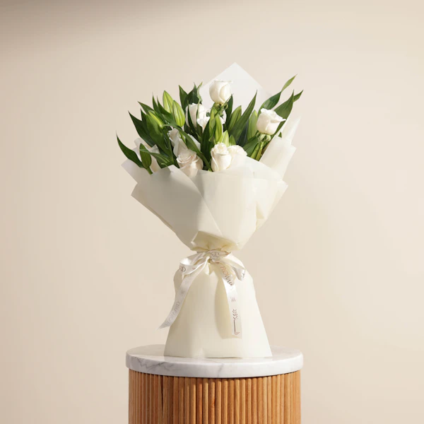 This stunning hand bouquet is the perfect gift. It features a beautiful blend of white lilies and white roses, symbolizing purity and innocence. The bouquet is carefully arranged and wrapped in crisp white paper, adding a touch of elegance and sophistication. The simple yet elegant design of this hand-tied bouquet is sure to make them feel loved and appreciated. Give the gift of timeless beauty with this hand bouquet of white lilies, white roses and white wrap!