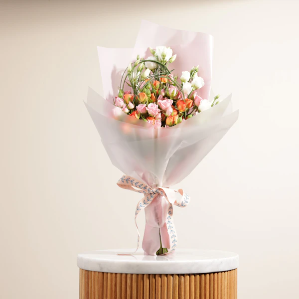 Surprise a loved one with a gift that indulges both their senses and their love for beautiful things. This exquisite set combines the captivating fragrance of Fae Loolya Perfume, 100ml, EDP - a scent that transcends gender - with a stunning arrangement of fresh blooms. The delicate Pink Baby Roses symbolize love and affection, while the vibrant Orange Baby Roses bring a touch of joy and cheer. Completing the ensemble are the White Eustoma, known for their purity and elegance. This thoughtful gift is sure to leave a lasting impression, perfect for birthdays, anniversaries, or simply to show someone you care.