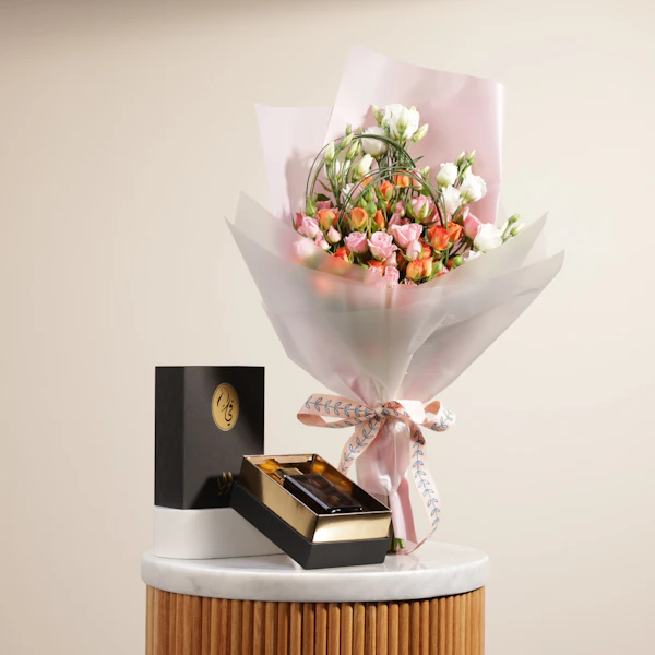BHD71Surprise a loved one with a gift that indulges both their senses and their love for beautiful things. This exquisite set combines the captivating fragrance of Fae Loolya Perfume, 100ml, EDP - a scent that transcends gender - with a stunning arrangement of fresh blooms. The delicate Pink Baby Roses symbolize love and affection, while the vibrant Orange Baby Roses bring a touch of joy and cheer. Completing the ensemble are the White Eustoma, known for their purity and elegance. This thoughtful gift is sure to leave a lasting impression, perfect for birthdays, anniversaries, or simply to show someone you care.