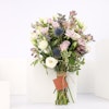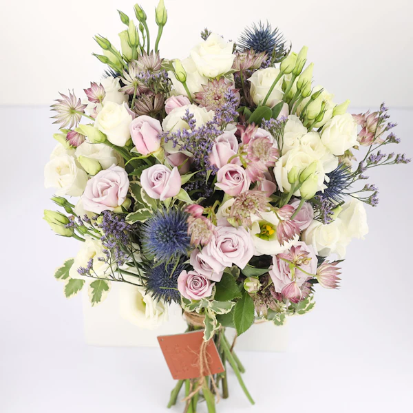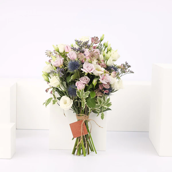 This hand bouquet features 18 flowers, including purple baby roses, pink alstroemeria, white eustoma, blue eryngium, blue sea lavender, and green pittosporum. Wrapped in a jute ribbon, it's a stunning gift for any occasion.