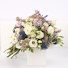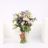 BHD16This hand bouquet features 18 flowers, including purple baby roses, pink alstroemeria, white eustoma, blue eryngium, blue sea lavender, and green pittosporum. Wrapped in a jute ribbon, it's a stunning gift for any occasion.