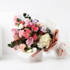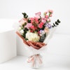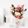 BHD55This opulent gift features the exquisite Fae Oud & Perfumes Nayla Dukhoon weighing 150 gm, paired with a luxurious floral arrangement. The incense, known for its rich aroma and cultural significance, adds a sense of tradition and luxury. Complementing this are the delicate blooms: white hydrangeas, purple and white eustomas, pink carnations, peach and pink baby roses, all beautifully presented in a blend of pink and white wraps. This combination of aromatic oud and vibrant flowers creates a sensory experience that celebrates elegance and sophistication. Perfect for marking special occasions or expressing profound appreciation, this gift leaves a lasting impression of beauty and thoughtfulness.