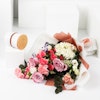 This opulent gift features the exquisite Fae Oud & Perfumes Nayla Dukhoon weighing 150 gm, paired with a luxurious floral arrangement. The incense, known for its rich aroma and cultural significance, adds a sense of tradition and luxury. Complementing this are the delicate blooms: white hydrangeas, purple and white eustomas, pink carnations, peach and pink baby roses, all beautifully presented in a blend of pink and white wraps. This combination of aromatic oud and vibrant flowers creates a sensory experience that celebrates elegance and sophistication. Perfect for marking special occasions or expressing profound appreciation, this gift leaves a lasting impression of beauty and thoughtfulness.