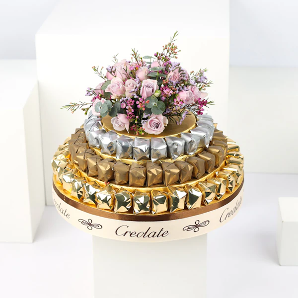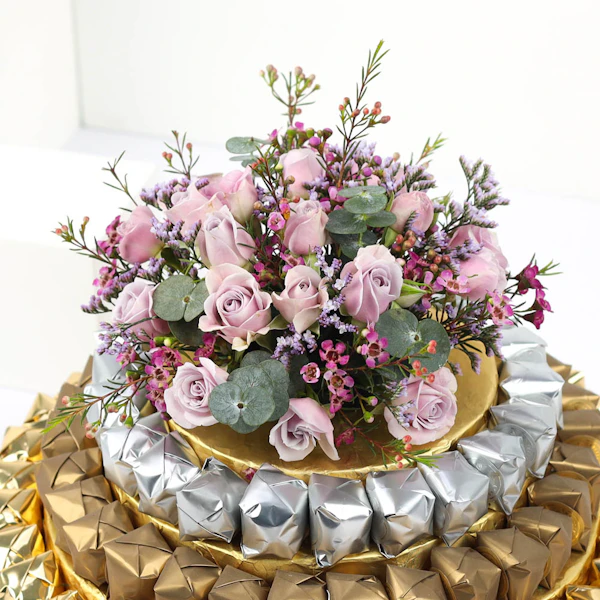 SKU FC72554Surprise your mother with the luxurious and delectable Creolate's Gem Collection chocolates this Mother's Day! Each bite of these handcrafted chocolates will be a heavenly delight for her taste buds. Gold is oreo filling, Silver is cappuccino, and Bronze is brownie. Add to this a bouquet of stunning purple baby roses and fragrant blue lavender to make her day even more special. The striking combination of purple and blue will leave a lasting impression on her and convey your love and affection for her. So go ahead, and make her day unforgettable with this thoughtful and indulgent gift!