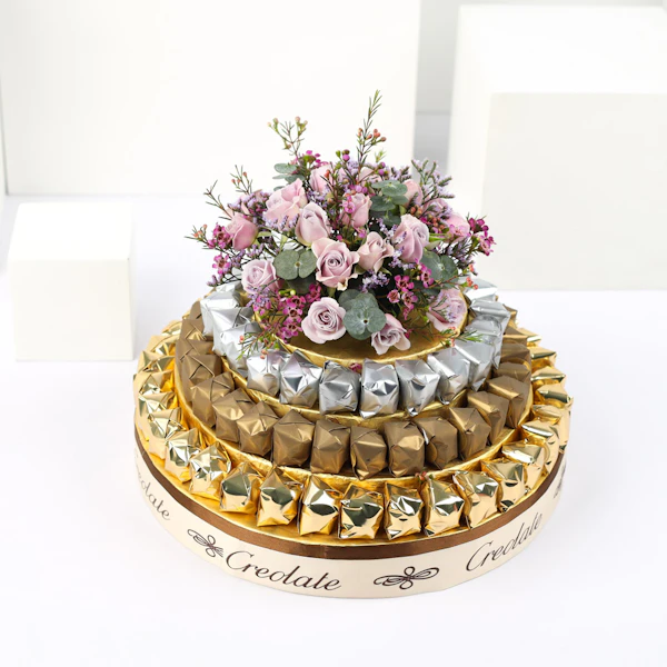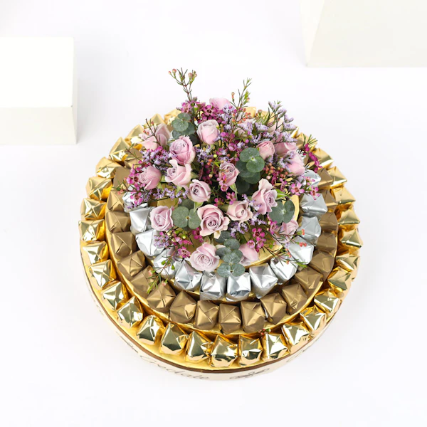 BHD60Surprise your mother with the luxurious and delectable Creolate's Gem Collection chocolates this Mother's Day! Each bite of these handcrafted chocolates will be a heavenly delight for her taste buds. Gold is oreo filling, Silver is cappuccino, and Bronze is brownie. Add to this a bouquet of stunning purple baby roses and fragrant blue lavender to make her day even more special. The striking combination of purple and blue will leave a lasting impression on her and convey your love and affection for her. So go ahead, and make her day unforgettable with this thoughtful and indulgent gift!