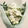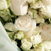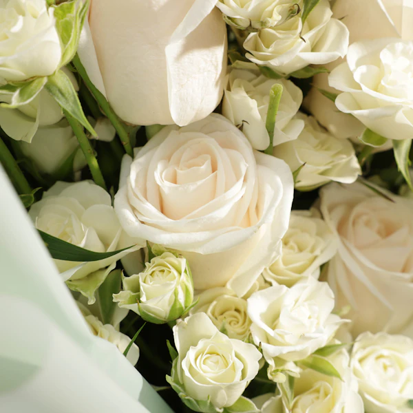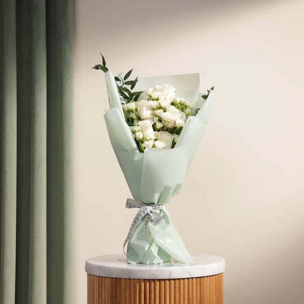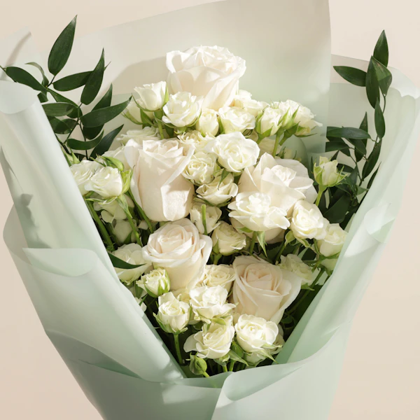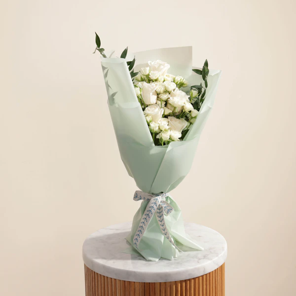 A bouquet of white roses, baby roses, and Italian Ruscus arranged with green wrapping would make for a beautiful and eye-catching floral arrangement. White roses symbolize purity, innocence, and new beginnings, while the delicate baby roses add a touch of softness and youthfulness to the bouquet. The Italian Ruscus, with its lush green leaves, provides a complementary contrast and adds texture to the arrangement. The green wrapping adds a natural touch and ties the look together, making the bouquet a fitting choice for a wide range of occasions, from weddings and anniversaries to birthdays and graduations.