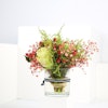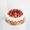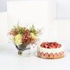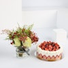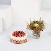 The arrangement contains Hypericum Red, Solidago-Yellow, Gypsophilia-Pink, Rose-Green and 1 KG Strawberry cake