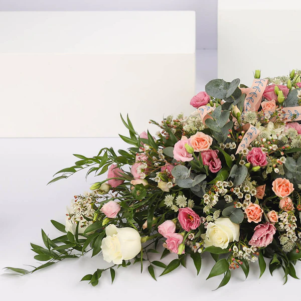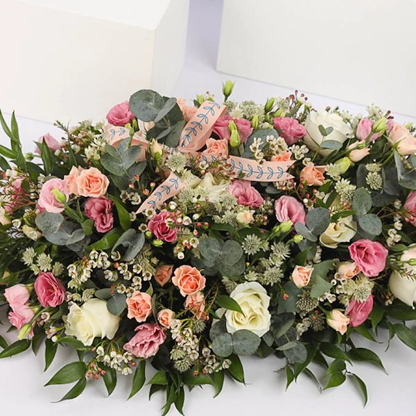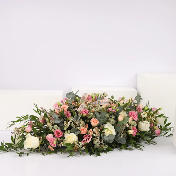 This Table Top Arrangement contains Baby Roses, Roses, Eucalyptus, Eustoma, Italian Ruscus, Waxflower, and Astrantia
