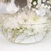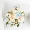 This arrangement contains Roses , Hydrangea , Gypsophilia and Eucalyptus cinerea