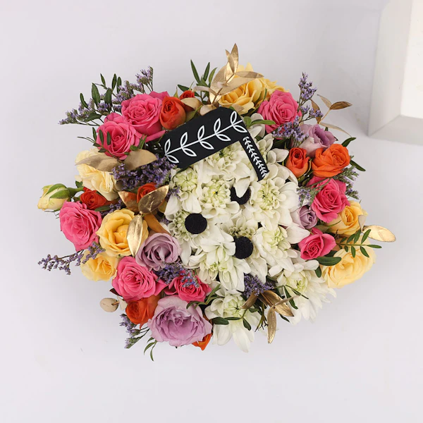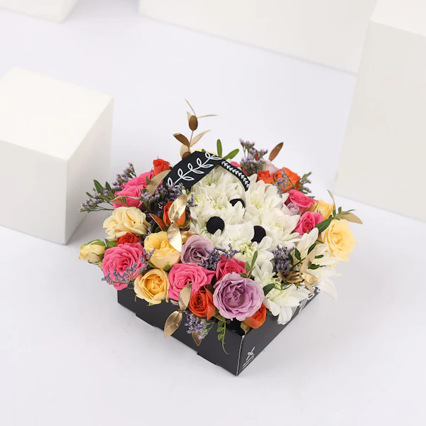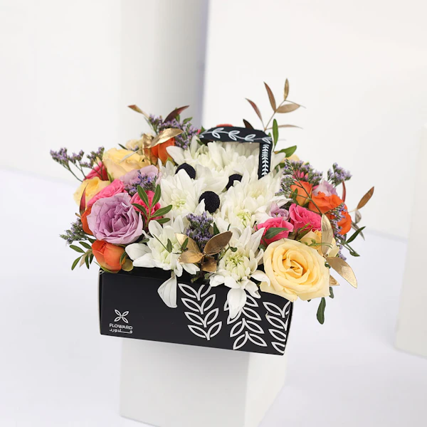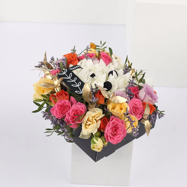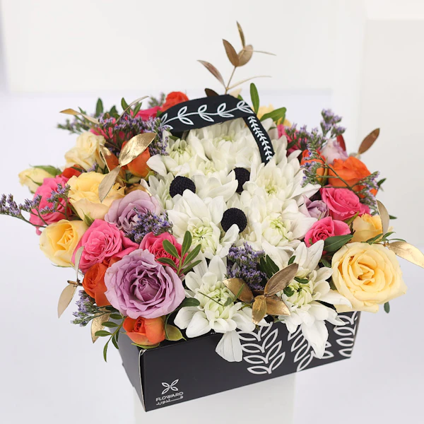 Celebrate their special day with this box arrangement containing Chrysanths, Baby Roses, Eucalyptus, and Sea Lavender
