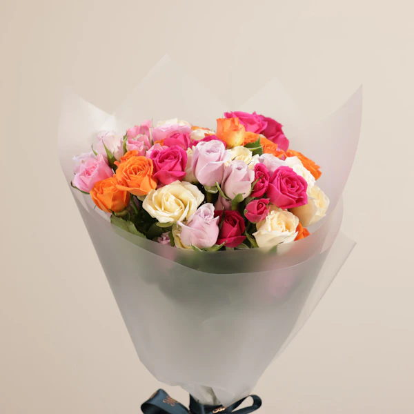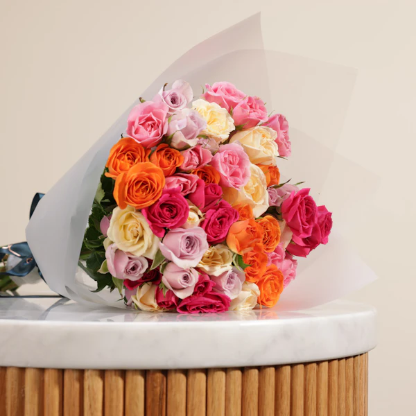 SKU FC07283Celebrate love with the Zia Love in Arabic Necklace, made of silver and beautifully gold plated, paired with a stunning bouquet of Pink Baby Roses, Fuchsia Baby Roses, Purple Baby Roses, Orange Baby Roses, and Peach Baby Roses. This luxurious gift set combines the elegance of fine jewelry with the beauty of fresh flowers, making it a perfect choice for any special occasion. Whether for an anniversary, birthday or just because, this thoughtful combination is sure to impress. Looking for luxury gifts online? Order now and surprise your loved one with this timeless and elegant set. Don’t wait—buy now and make your day unforgettable with this unique blend of style and beauty.