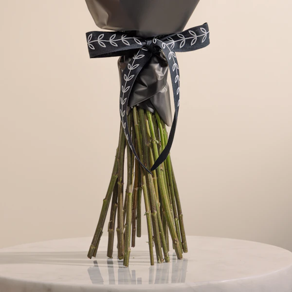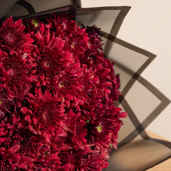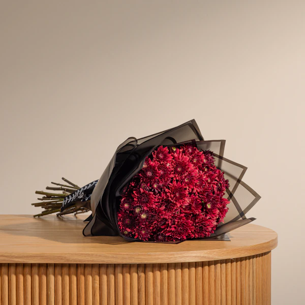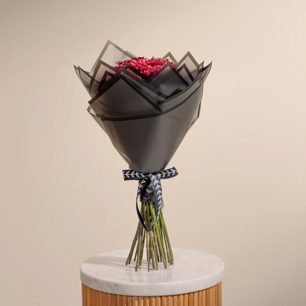 This beautiful hand bouquet of 20 red chrysanthemums wrapped in black wrapping paper is an elegant display of love. The red color of the chrysanthemums represents passion, while the black wrapping paper adds a touch of mystery. The arrangement creates a visually striking and elegant piece that is a perfect gift for any occasion.