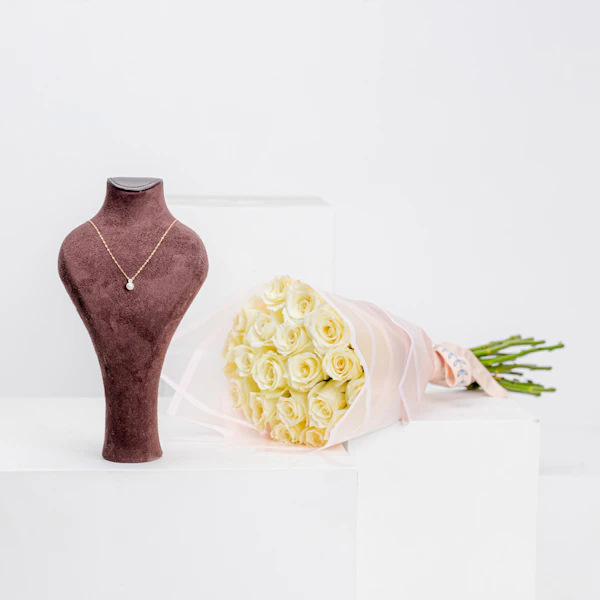 Elevate your gifting experience with our luxurious combination the L'azurde Gold Pearl Necklace, a timeless masterpiece crafted in 18k gold weighing 4.31 grams, accompanied by a charming bouquet of white roses. Exuding elegance and sophistication, the necklace features lustrous pearls set amidst intricate gold detailing, adding a touch of refinement to any ensemble. Paired with the pristine beauty of white roses, this gift embodies purity and grace, making it an exquisite choice for expressing love and appreciation. Celebrate special moments and cherished relationships with this enchanting combination that promises to captivate hearts and leave a lasting impression.