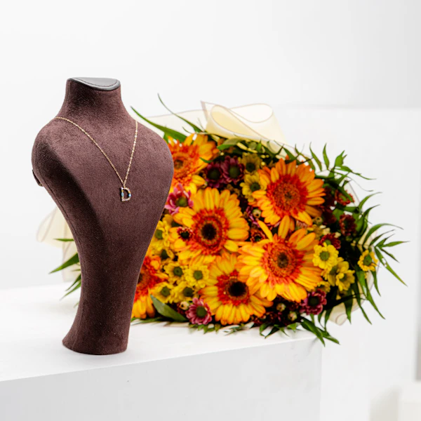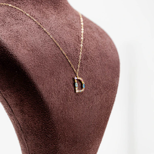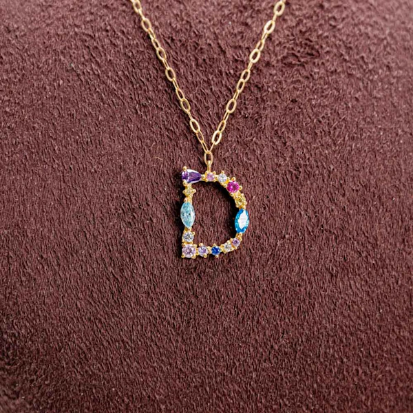 Make a stylish statement with the L'azurde Letter D Colored Stones Necklace, a chic and personalized accessory crafted for the modern trendsetter. Crafted from exquisite 18K gold, this necklace features the letter D embellished with a dazzling array of colorful gemstones. From the fiery hues of Orange Gerbera to the soft tones of Peach and Yellow Chrysanthemums, each stone is meticulously selected for its brilliance and charm. The Brown Wrap adds a touch of sophistication, ensuring this necklace stands out in any ensemble. Whether worn solo or layered with other favorites, it's a versatile piece that adds instant glamour to any look.