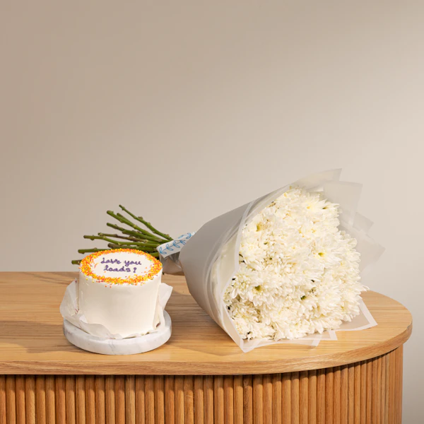 Introducing our exquisite gift set featuring a hand bouquet of 20 vibrant chrysanthemums paired with Nino's Rosette Bento. Celebrate a milestone with the delightful rosettes, filled with heavenly chocolate ganache. Perfect for sharing, our 3-inch bento fits 2-4 people, making it an ideal treat for any occasion. This elegant combination of fresh flowers and gourmet chocolates is sure to bring joy and sophistication to your celebration. Order now to surprise your loved ones with a thoughtful and delicious gift!