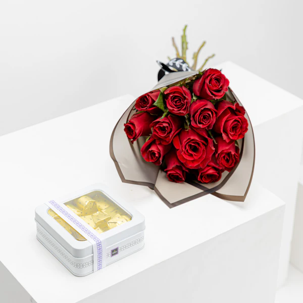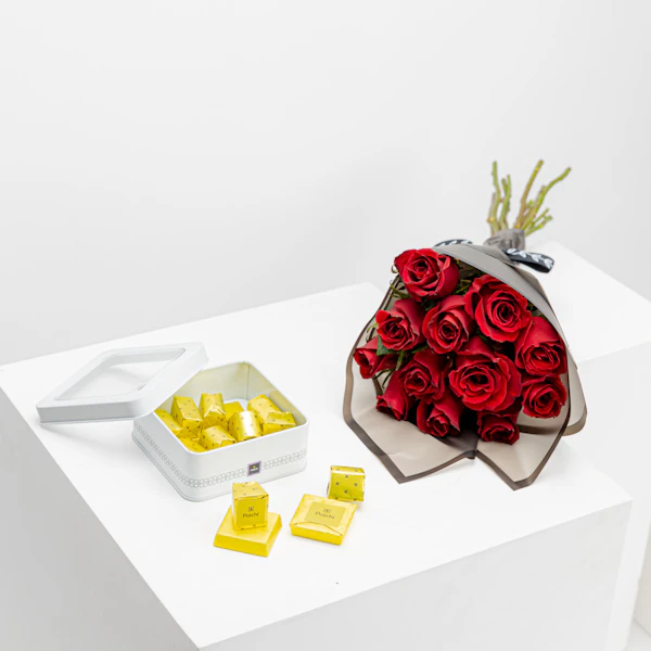 EGP3220Indulge in the epitome of romance with our exquisite gift set! The Patchi tin chocolate box, adorned with delectable chocolates, pairs seamlessly with a stunning bouquet of vibrant red roses, elegantly wrapped in black. Elevate your moments of love and passion with this perfect combination, where the rich flavors of Patchi chocolates complement the timeless beauty of red roses. It's not just a gift; it's a celebration of love and sweetness. Make every occasion special with this delightful union of Patchi's finest chocolates and the enchanting allure of red roses. Cherish the magic of love with our Patchi tin chocolate box and red rose bouquet in black wrapping.