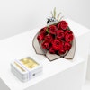 SKU FC02754Indulge in the epitome of romance with our exquisite gift set! The Patchi tin chocolate box, adorned with delectable chocolates, pairs seamlessly with a stunning bouquet of vibrant red roses, elegantly wrapped in black. Elevate your moments of love and passion with this perfect combination, where the rich flavors of Patchi chocolates complement the timeless beauty of red roses. It's not just a gift; it's a celebration of love and sweetness. Make every occasion special with this delightful union of Patchi's finest chocolates and the enchanting allure of red roses. Cherish the magic of love with our Patchi tin chocolate box and red rose bouquet in black wrapping.