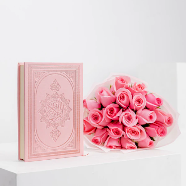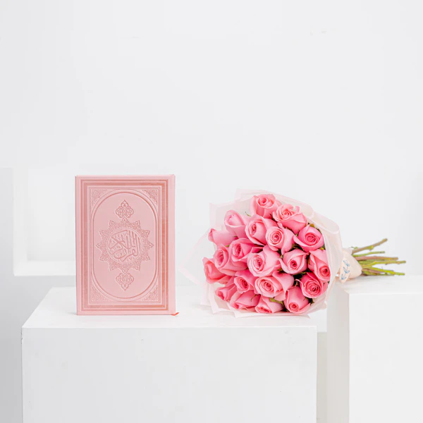 Illuminate your spirit with the Pink Holly Quran from Tip Of The Day. This exquisite Quran, adorned with delicate pink hues, embodies the essence of spiritual enlightenment and guidance. Coupled with a captivating bouquet of Revival Roses, each bloom symbolizes renewal and abundance, fostering a sense of serenity and reverence. Whether for personal reflection or as a heartfelt gift, this combination invites moments of contemplation and connection with the divine. Honor the beauty of spirituality and convey heartfelt wishes of peace and prosperity with this meaningful and beautiful gift ensemble.