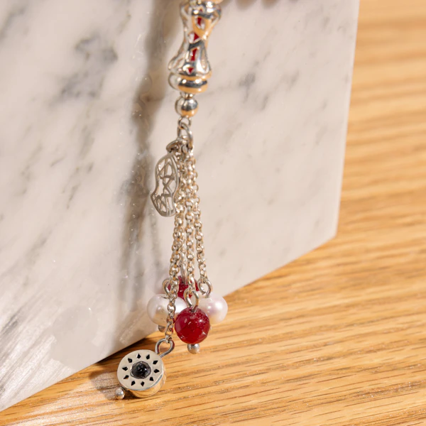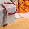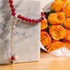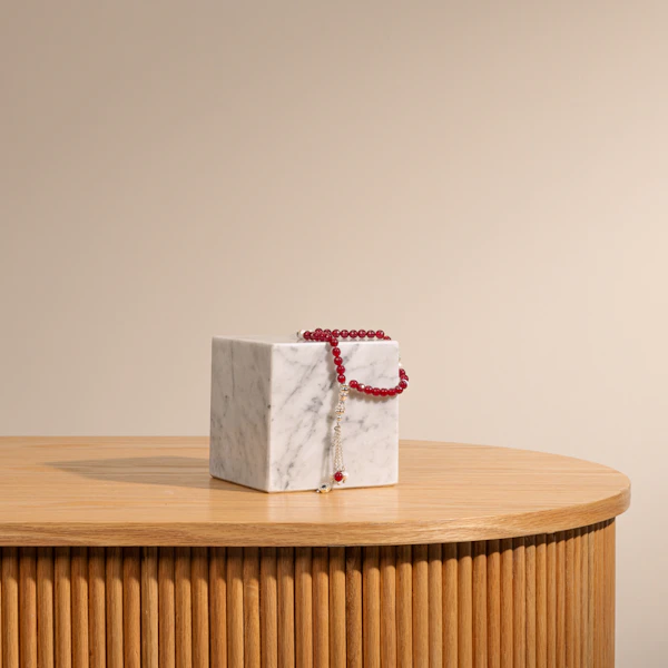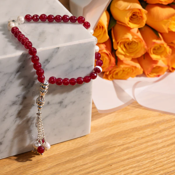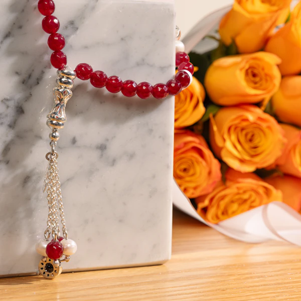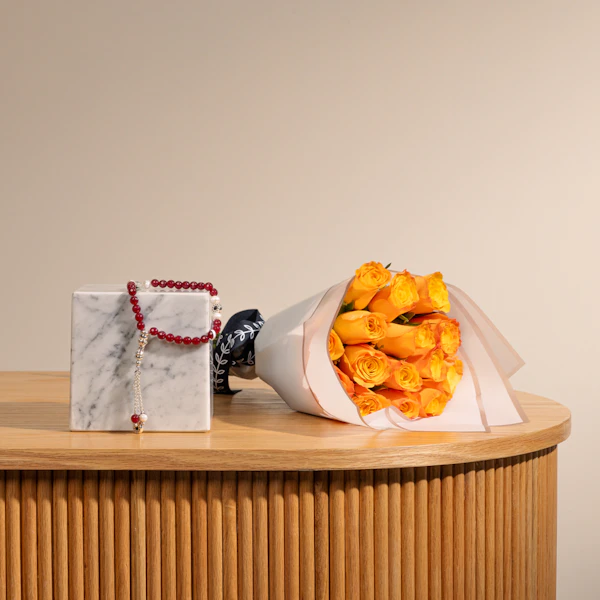 Al Sebha Red Rosary, meticulously crafted with 33 beads of ruby, silver, and pearl, exudes elegance and spirituality. Accompanied by a bouquet of vibrant orange roses, delicately arranged and presented in a pristine white wrap, this gift transcends materiality, embodying sentiments of love, spirituality, and beauty. The rosary serves as a symbol of devotion and faith, while the radiant roses symbolize passion and admiration. Together, they create a profound impact, fostering a sense of connection and gratitude in the recipient. This thoughtful gesture resonates deeply, invoking feelings of serenity and appreciation, enriching both the spirit and the heart with its timeless beauty and sentiment.