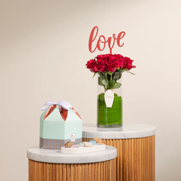Delight your loved one with the ShanShal 1 KG Chocolate Box, accompanied by 20 vibrant red roses elegantly arranged in a glass vase and a charming Love topper. This exquisite gift set combines the rich, indulgent taste of premium chocolates with the timeless beauty of fresh red roses. Perfect for expressing love and affection, this luxurious combination is ideal for any special occasion. Make your gesture unforgettable with this elegant and thoughtful gift. Order now and bring joy and romance to someone special.