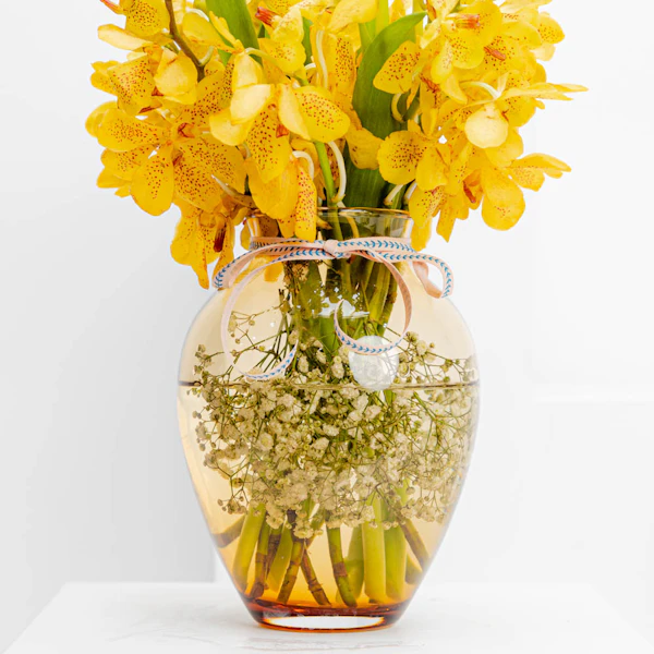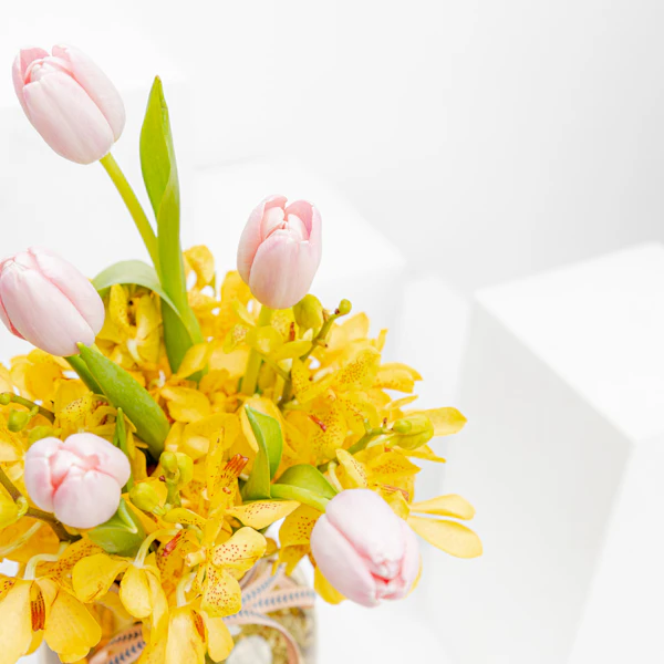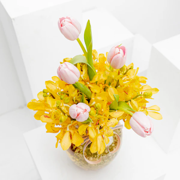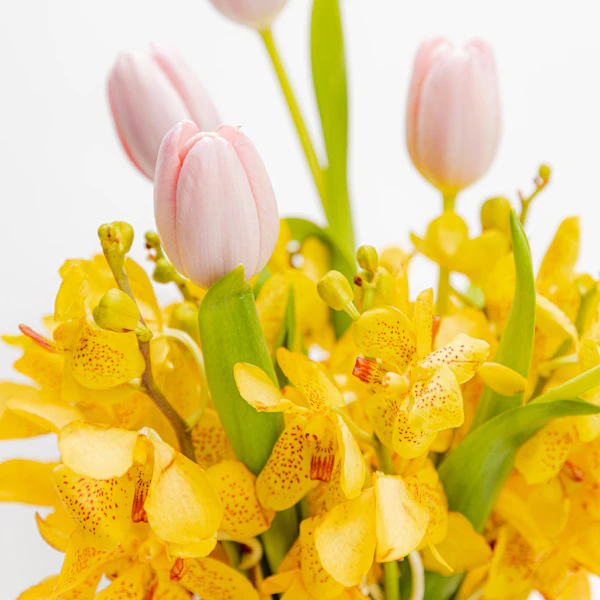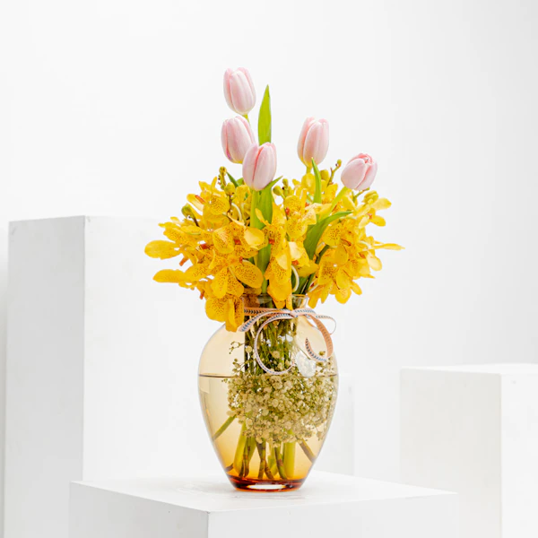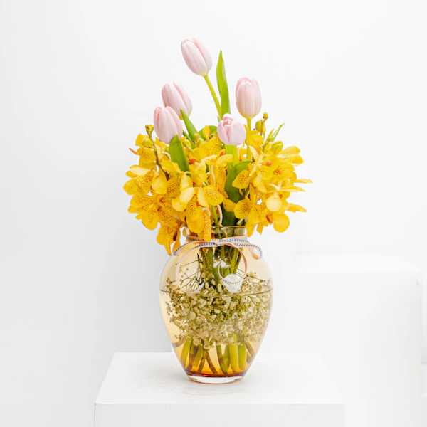 Capture the essence of elegance with our exquisite gift: a delicate arrangement featuring yellow baby orchids and pink tulips presented in the luxurious Floward Premium Vase. This charming ensemble blends the beauty of nature with contemporary design, making it the perfect gesture for special occasions. Elevate your gifting experience and convey warmth and sophistication with this harmonious fusion of vibrant blooms and a premium vase, ensuring a memorable and stylish expression of affection.