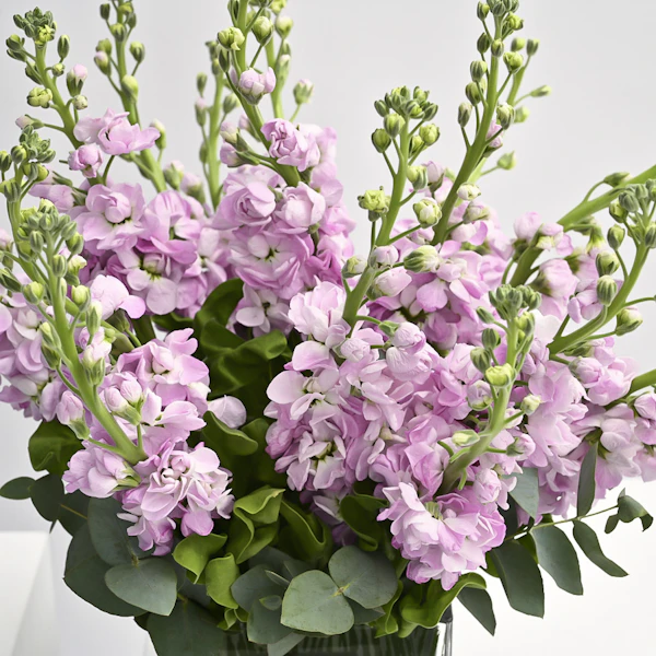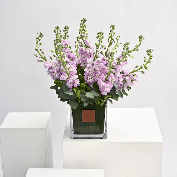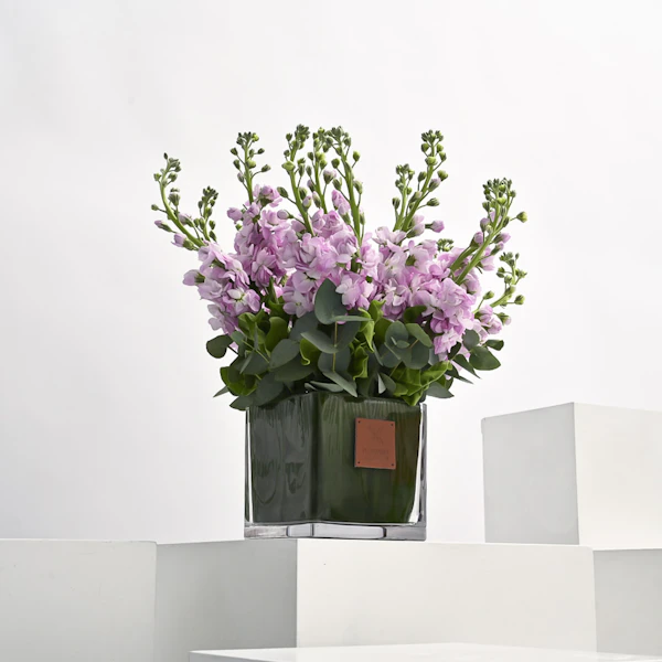 This vase is filled with stunning pink matthiola flowers, also known as stock flowers. The delicate blooms are arranged beautifully, creating a gorgeous display that will brighten up any room. Their sweet and spicy fragrance will fill the air and bring a sense of joy to the recipient. This gift is perfect for any occasion, whether it's to celebrate a birthday, express gratitude, or simply to say "I'm thinking of you."