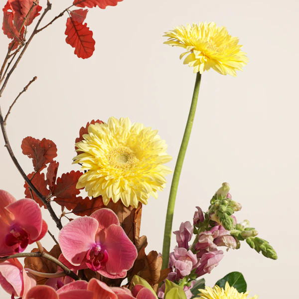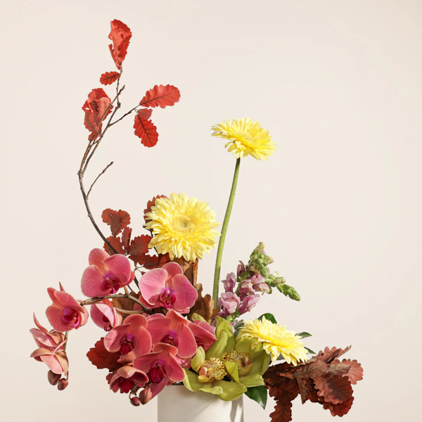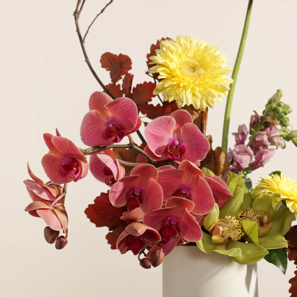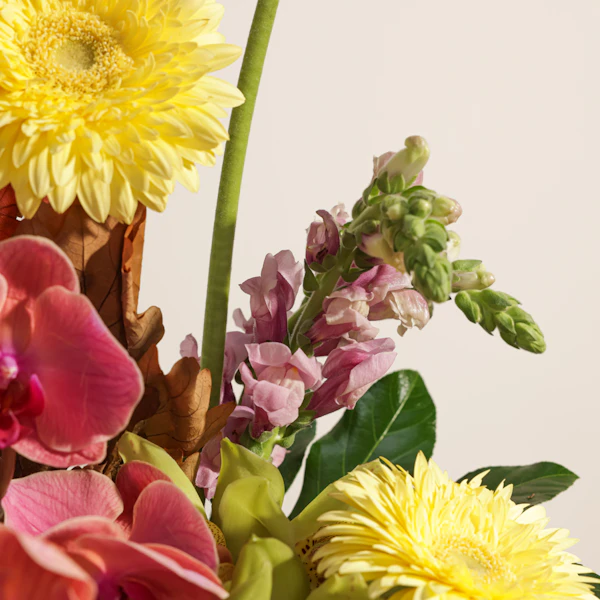 Elevate your space with our stunning floral arrangement featuring Gerbera Spider and Coral Sunset Phalaenopsis. This exquisite combination is elegantly displayed in a sleek cylinder ceramic vase, creating a perfect blend of vibrant colors and sophisticated design. The Gerbera Spider adds a unique touch with its spiky petals, with perfect Antirrhinum potomac lavender , while the Coral Sunset Phalaenopsis brings a touch of tropical elegance. Ideal for adding a splash of color and charm to any room. Buy now to enjoy this eye-catching arrangement and enhance your home or office with these luxurious blooms.