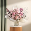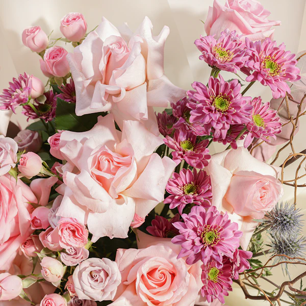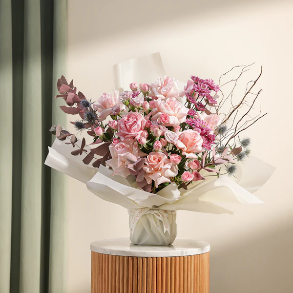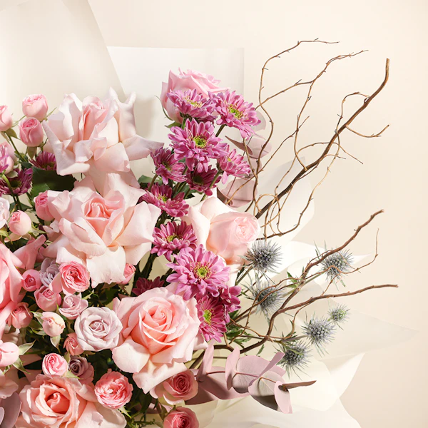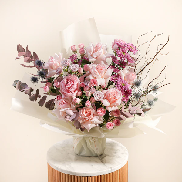 Introducing our Elegant Birthday Bouquet, a graceful handcrafted arrangement bursting with seasonal charm. This exquisite ensemble features the enchanting hues of Rose Pink, Baby Rose Pink and Purple, Chrysanthemum Pink, complemented by the striking texture of Eryngium Blue, and the fresh scents of Eucalyptus and Salix. Expertly curated to convey warmth and celebration, it's the perfect gift to send heartfelt birthday wishes. Complete with an acrylic stick bearing Happy Birthday, this bouquet adds a festive touch to any celebration. Embrace the beauty of nature and the art of gifting with our Elegant Birthday Bouquet, sure to brighten their special day with elegance and joy.
