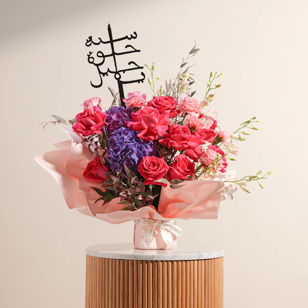 EGP27Gift a stunning birthday bouquet featuring fuchsia roses, pink roses, purple hydrangea, pink baby orchids, and pink carnations, all beautifully arranged to celebrate the special day. This vibrant and elegant mix of blooms creates a visually captivating display, enhanced by a "Happy Birthday" stick. Perfect for adding a touch of sophistication and joy, this bouquet makes an unforgettable gift that brightens the recipient's celebration and shows your heartfelt wishes.