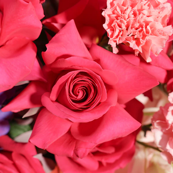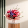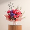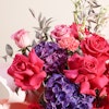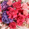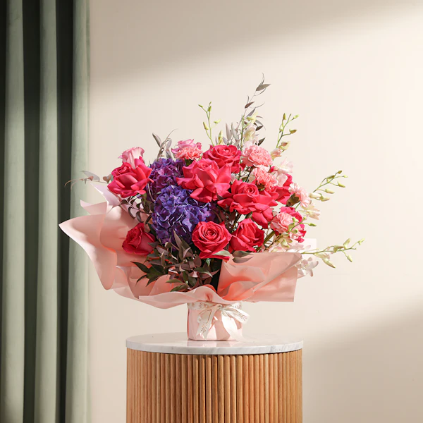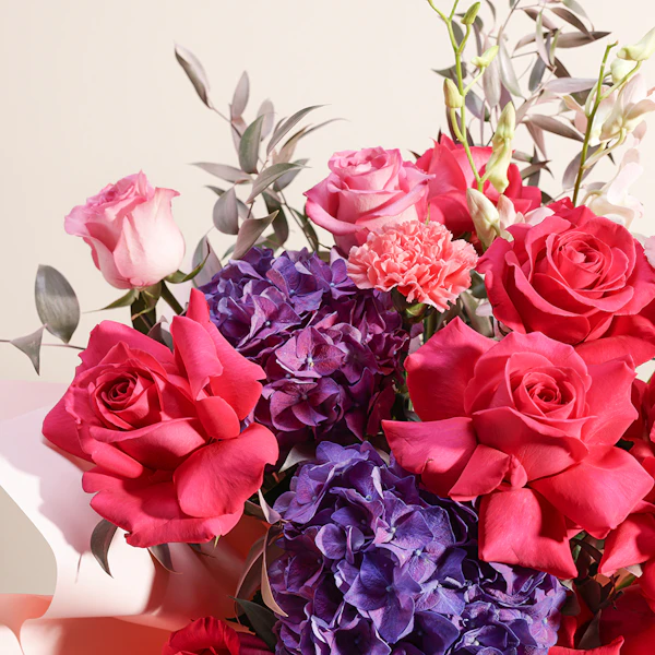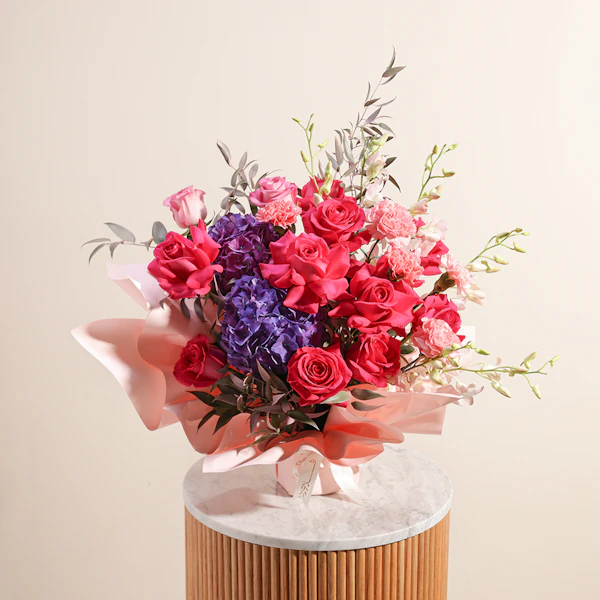Gift a stunning birthday bouquet featuring fuchsia roses, pink roses, purple hydrangea, pink baby orchids, and pink carnations, all beautifully arranged to celebrate the special day. This vibrant and elegant mix of blooms creates a visually captivating display, enhanced by a "Happy Birthday" stick. Perfect for adding a touch of sophistication and joy, this bouquet makes an unforgettable gift that brightens the recipient's celebration and shows your heartfelt wishes.