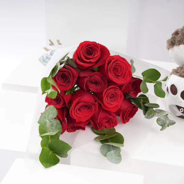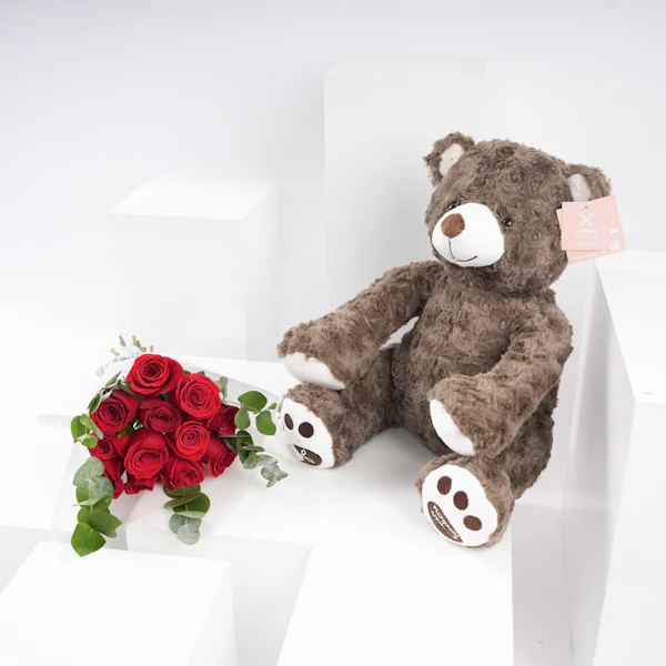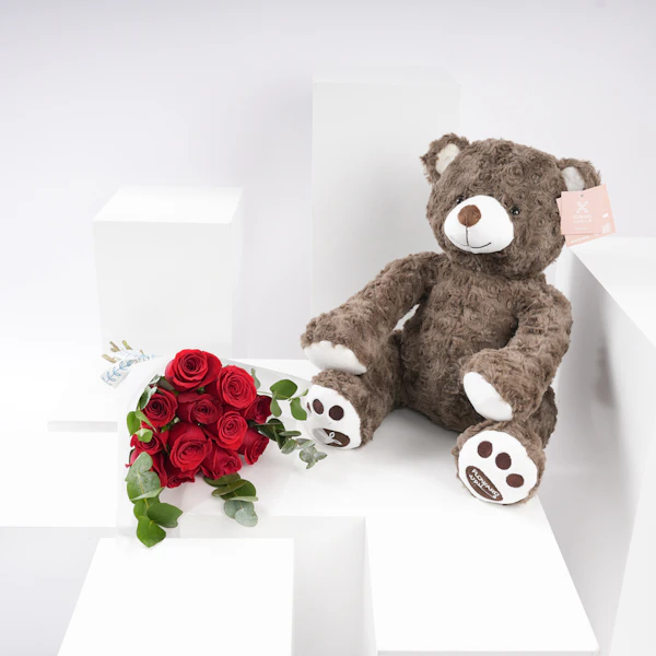 On this special day of love, I present to you an exceptional gift that expresses the depths of love and affection. This wonderful gift consists of a large brown teddy bear, symbolizing luxury and warmth. This beautiful teddy bear comes accompanied by a bouquet of radiant red roses, adding to the warmth of the gift. The perfect balance between the charming teddy bear and the bouquet of red roses embodies elegance and love. Make Valentine's Day special for your loved one with this luxurious gift that tells a story of your sincere and love-filled emotions. Let this gift narrate the tale of your affections with words of romance and warmth, without the need for spoken language.