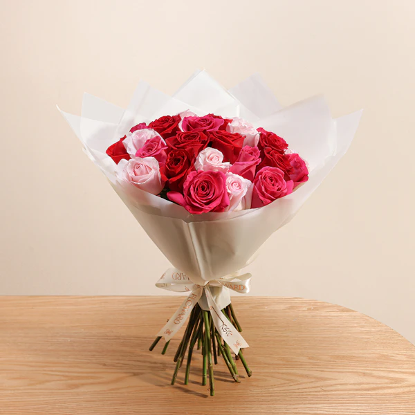 EGP19This exquisite floral arrangement brings together the timeless beauty of roses in a stunning palette of colors. The bouquet features delicate pink roses, symbolizing grace and admiration; vibrant fuchsia roses, representing excitement and passion; and classic red roses, embodying deep love and respect. Each rose is carefully selected for its freshness and quality, and the ensemble is elegantly wrapped in a luxurious cream-colored paper. The understated wrap enhances the vividness of the roses while adding a touch of sophistication. Ideal for celebrating a special occasion, expressing heartfelt sentiments, or simply brightening someone's day, this arrangement is a perfect blend of beauty and meaning Order now to enjoy these exquisite flowers and brighten your loved ones' day.