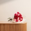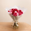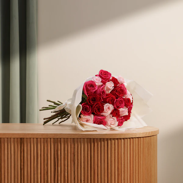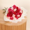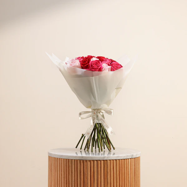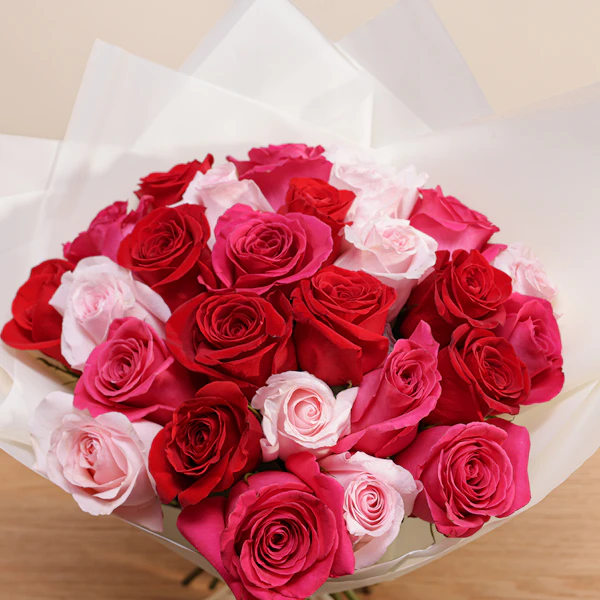 This exquisite floral arrangement brings together the timeless beauty of roses in a stunning palette of colors. The bouquet features delicate pink roses, symbolizing grace and admiration; vibrant fuchsia roses, representing excitement and passion; and classic red roses, embodying deep love and respect. Each rose is carefully selected for its freshness and quality, and the ensemble is elegantly wrapped in a luxurious cream-colored paper. The understated wrap enhances the vividness of the roses while adding a touch of sophistication. Ideal for celebrating a special occasion, expressing heartfelt sentiments, or simply brightening someone's day, this arrangement is a perfect blend of beauty and meaning Order now to enjoy these exquisite flowers and brighten your loved ones' day.