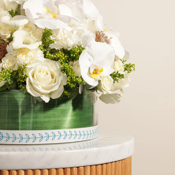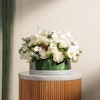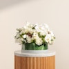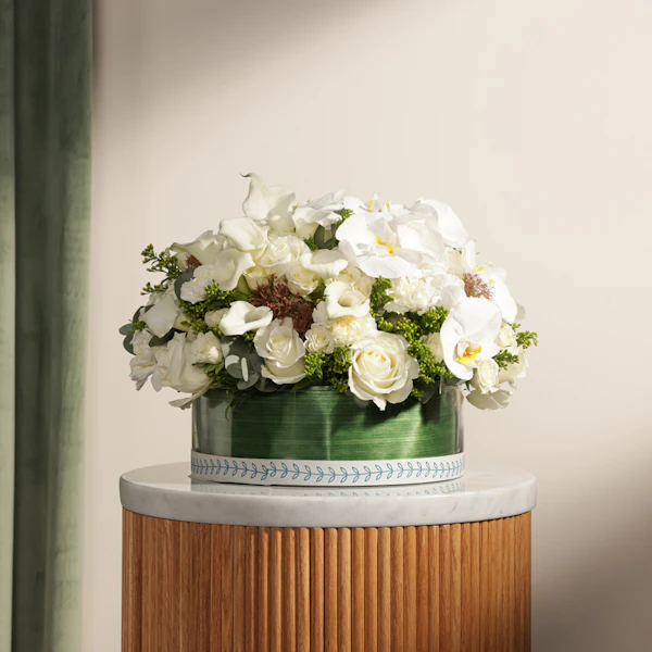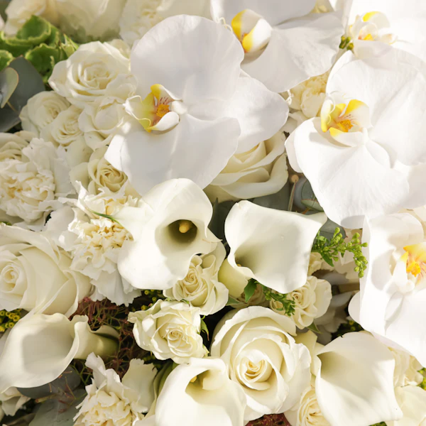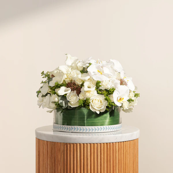Immerse your loved ones in the ethereal beauty of our fresh radiance flower vase. This exquisite arrangement showcases the purity of white blooms, including elegant roses, delicate baby roses, sophisticated calla lilies, charming carnations, graceful orchids, and lush hydrangeas. Arranged in a stylish round glass vase, each flower exudes a fresh, radiant glow. Ideal for creating unforgettable moments, this stunning bouquet brings a sense of grand elegance and heartfelt joy to you and your loved ones.