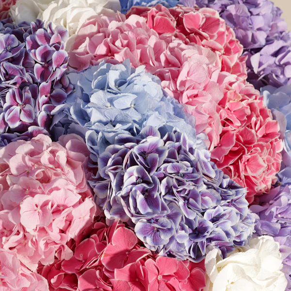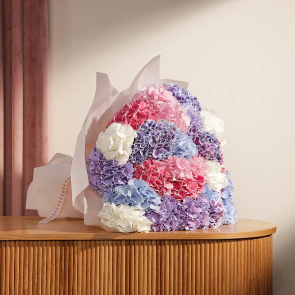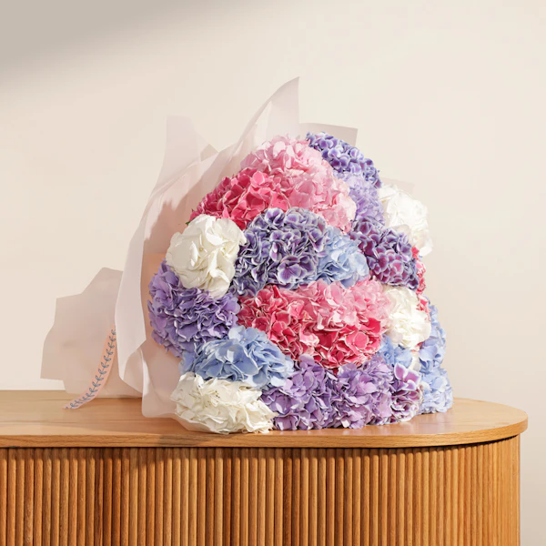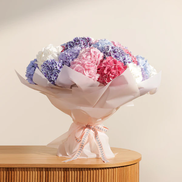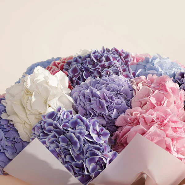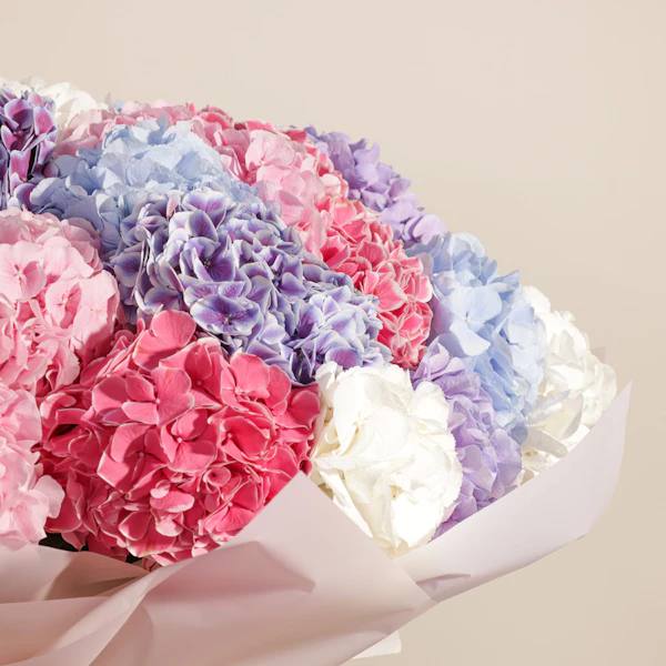 Embrace the beauty of nature with this enchanting bouquet featuring a harmonious blend of Blue Hydrangea, Maglinn Hydrangea, White Hydrangea, Lilac Hydrangea, and Pink Hydrangea delicately arranged in a soft pink wrap. Each bloom exudes its unique charm, creating a stunning ensemble that captivates with its blend of vibrant hues and elegant presentation. Perfect for celebrating special occasions or simply brightening someone's day with a touch of floral splendor.