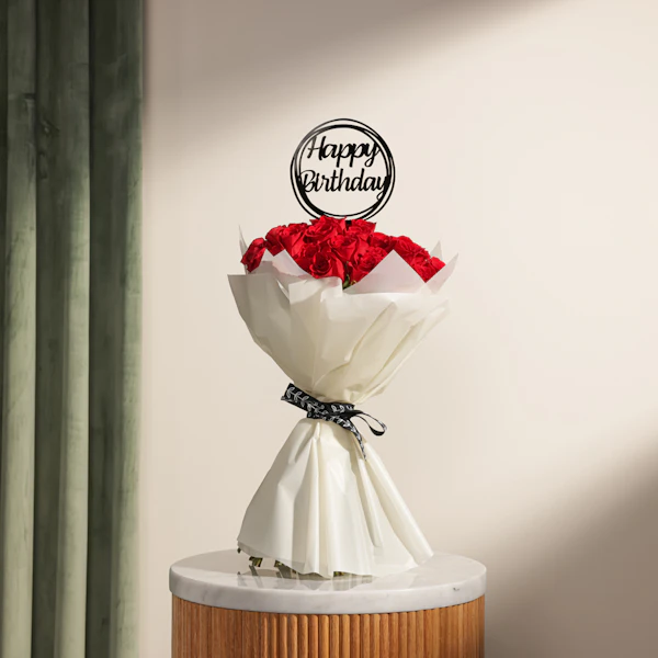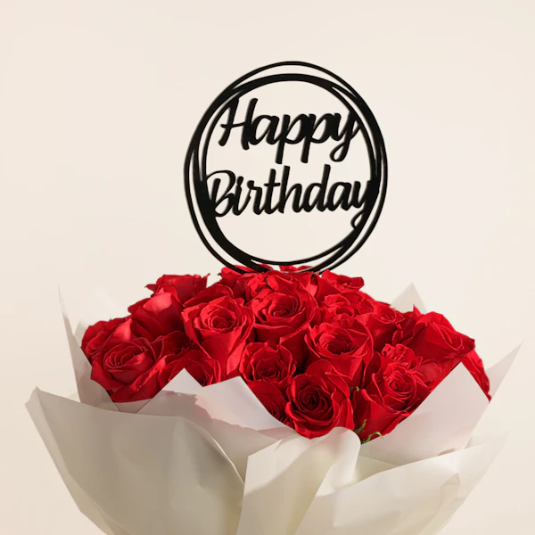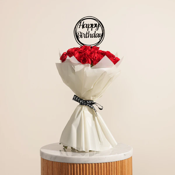 EGP32Celebrate with elegance and charm with our Red Roses in Cream Wrap, adorned with a Happy Birthday topper. This stunning bouquet features vibrant red roses, symbolizing love and admiration, artfully arranged in a soft cream wrap that adds a touch of sophistication. Whether you're surprising a loved one, friend, or colleague, these roses convey heartfelt birthday wishes in a memorable and thoughtful way. Perfect for adding beauty and joy to any birthday celebration, this gift is sure to leave a lasting impression.