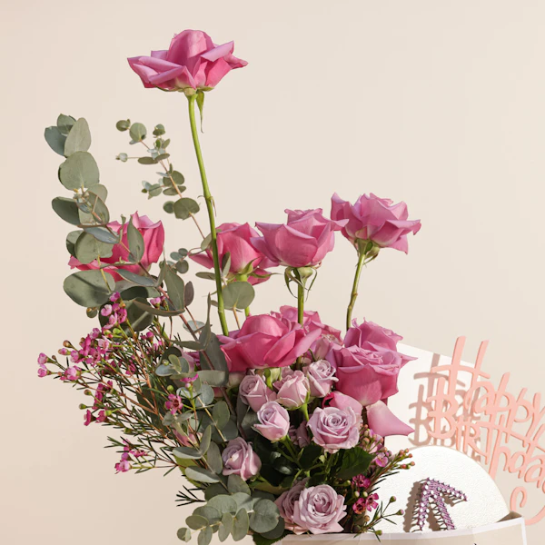 SKU FC19211Celebrate a special birthday with the Maisam Qassem Sagittarius Art Piece, a stunning fusion of artistry and nature. This unique gift features the enchanting Purple Rose, symbolizing enchantment and admiration, paired with delicate Purple Baby Roses that convey elegance and grace. Topped with a cheerful Happy Birthday topper, this arrangement showcases the intricate craftsmanship of Maisam Qassem and offers a heartfelt expression of your best wishes, making it an unforgettable gift for those born under the Sagittarius sign.