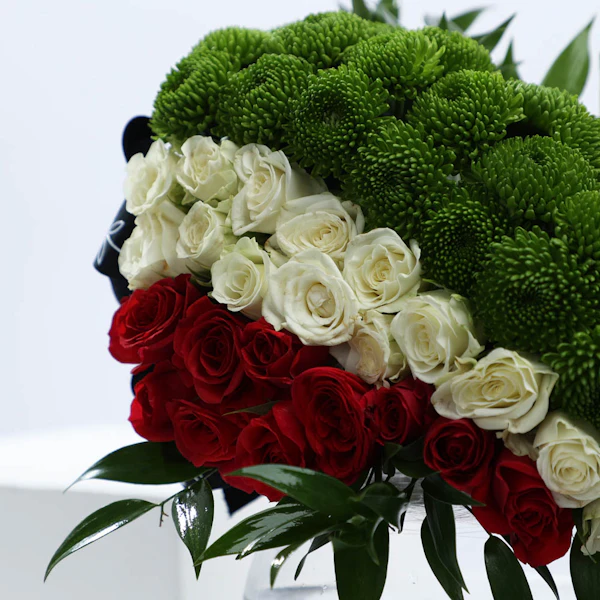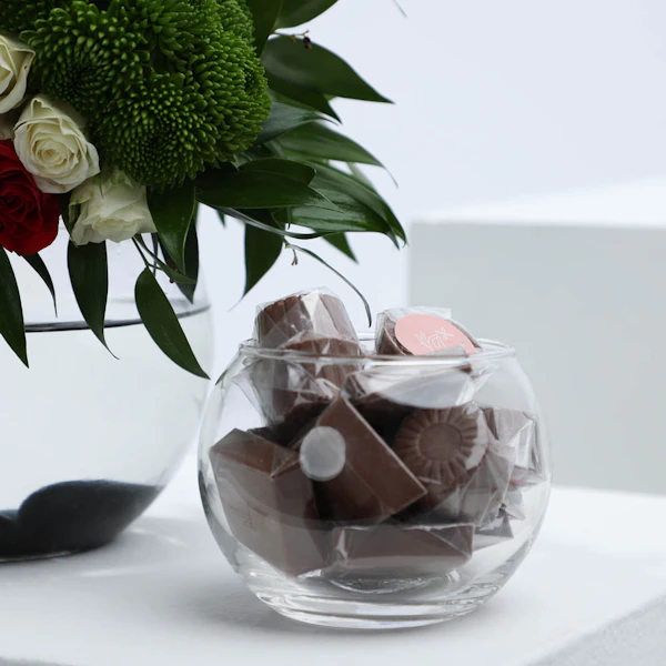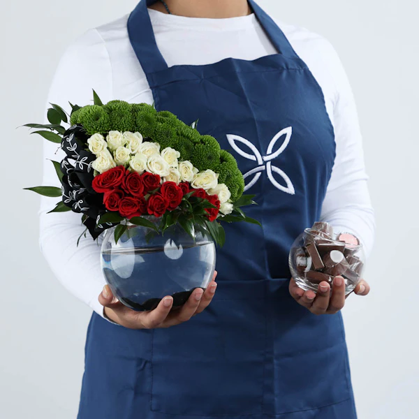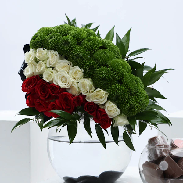 EGP21Mark Kuwait's National Day with the tasteful elegance of Floward Chocolates, featuring a delightful assortment of round and square chocolates in plain and caramel flavors. Accompanied by a stunning arrangement of eight flowers, including red and white baby roses and lush green chrysanthemums, all presented in a charming glass fishbowl, this gift is a heartfelt tribute to Kuwait's unity and prosperity. Each chocolate and every bloom symbolizes the nation's vibrant spirit and enduring resilience, making it a meaningful gesture of celebration and gratitude on this momentous occasion.