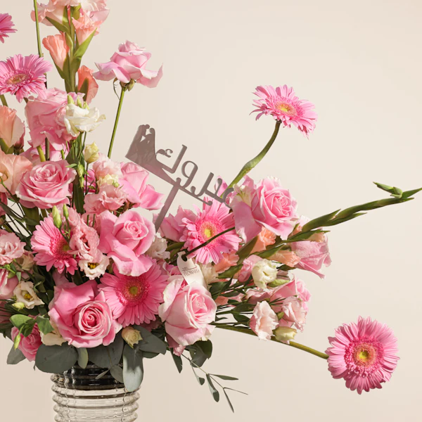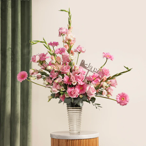 EGP61Celebrate a special occasion with the elegance of this beautiful floral arrangement, featuring Rose Rosita Vendela, Pink Gerbera, and Pink Eustoma, complemented by the striking Sugar Babe Gladiolus and fresh Green Eucalyptus. Arranged in a round crystal vase, this bouquet exudes sophistication and charm. The Congratulations topper adds a thoughtful touch, making it the perfect gift to mark any milestone. Whether you’re celebrating a graduation, promotion, or any achievement, this stunning arrangement will leave a lasting impression. Order now and make someone’s special day even brighter with this elegant and heartfelt floral gift!