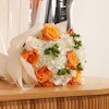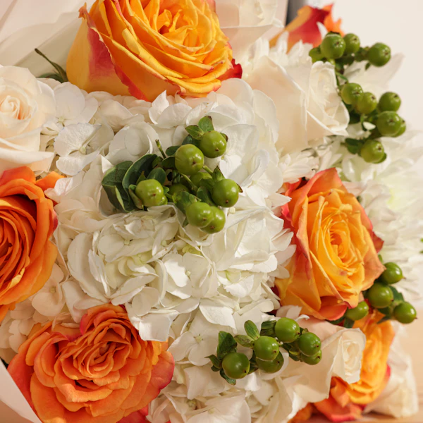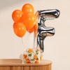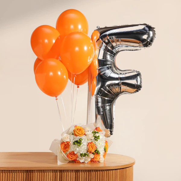 Elevate your celebrations with a vibrant Orange Hand Bouquet, paired with orange balloons and a shiny silver foil letter "F." This cheerful bouquet is filled with fresh Cherry Brandy Roses, White Roses, White Chrysanthemums, White Hydrangea, and Green Hypericum, all elegantly wrapped in a cream wrap. The bright orange flowers make it an eye-catching gift for any special occasion. Whether it's a birthday, anniversary, or simply to brighten someone's day, this bouquet is the perfect choice. Don’t wait—buy now to make your celebration unforgettable!