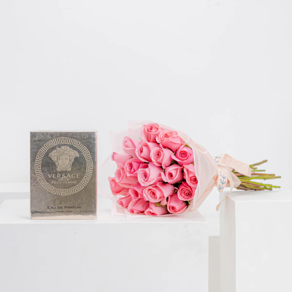 Indulge your loved one in the luxurious femininity of Versace Eros Pour Femme Eau de Parfum, a captivating fragrance crafted for an elegant charming woman. Elevate the experience with a touch of natural beauty by pairing it with our rose revival bouquet, enveloped in enchanting pink wrapping. This perfect combination of exquisite perfume and beautiful roses epitomizes elegance and sophistication, making it the ultimate gift for the woman who appreciates beauty and grace.