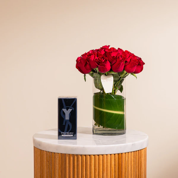 Unveil a gift that embodies sophisticated masculinity. This captivating set combines the allure of Yves Saint Laurent's Y Eau de Parfum for Men, 100ml, with the timeless elegance of red roses. The fragrance, a captivating blend of freshness and intensity, leaves a beautiful smell. Each note - from the vibrant citrus opening to the warm woody base - is a testament to modern luxury. Nestled beside this olfactory masterpiece, a bouquet of red roses adds a touch of romance and passion. Together, they create a gift that's guaranteed to make a lasting impression, a perfect way to show him you appreciate his bold spirit and timeless style.