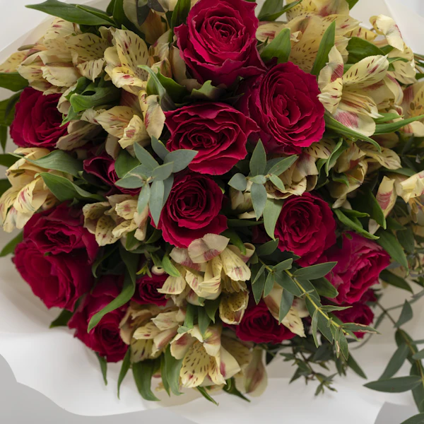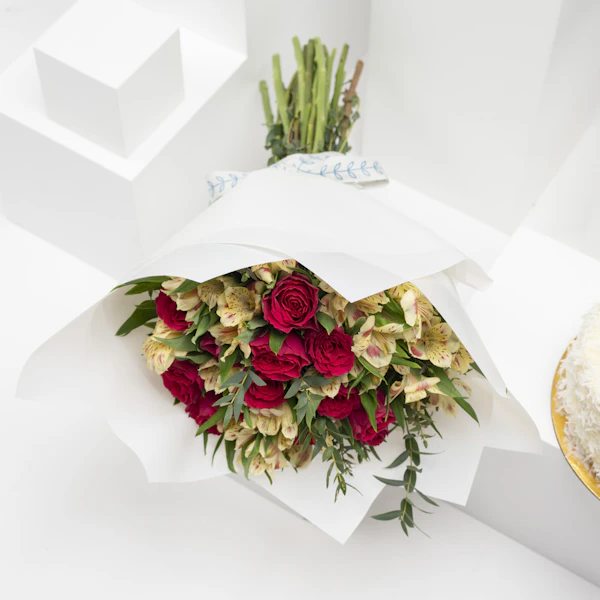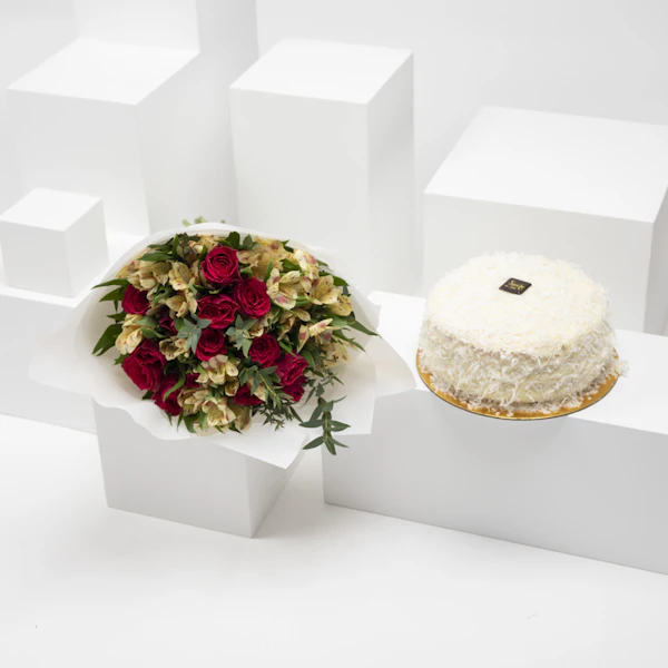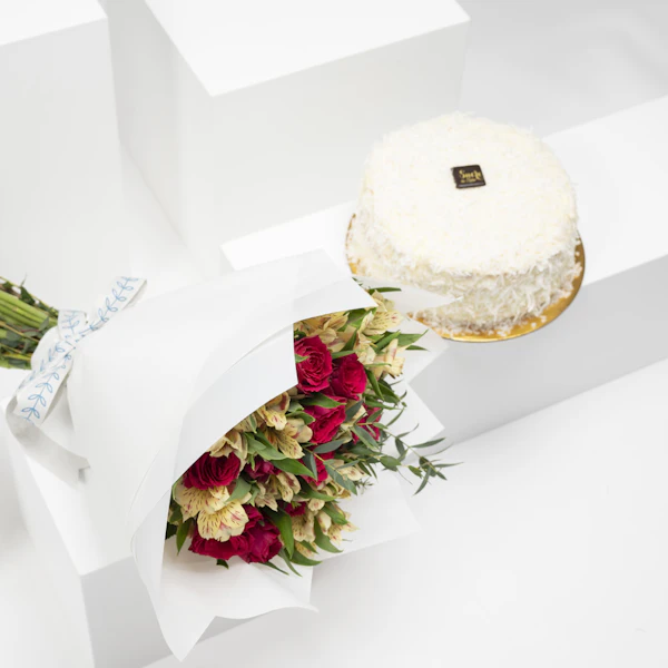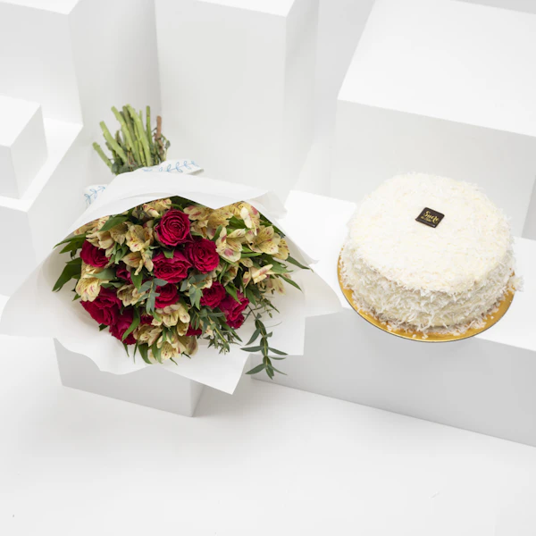 This collaboration includes a cake of your choice and a charming bouquet of fifteen red roses & ten Alstroemeria is added, all wrapped together neatly with our signature Floward ribbon.