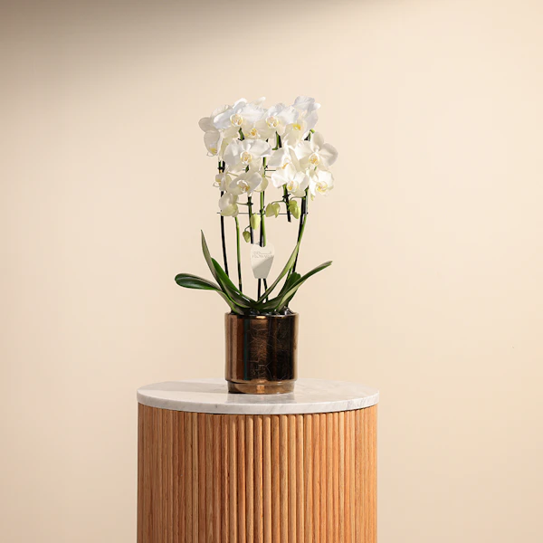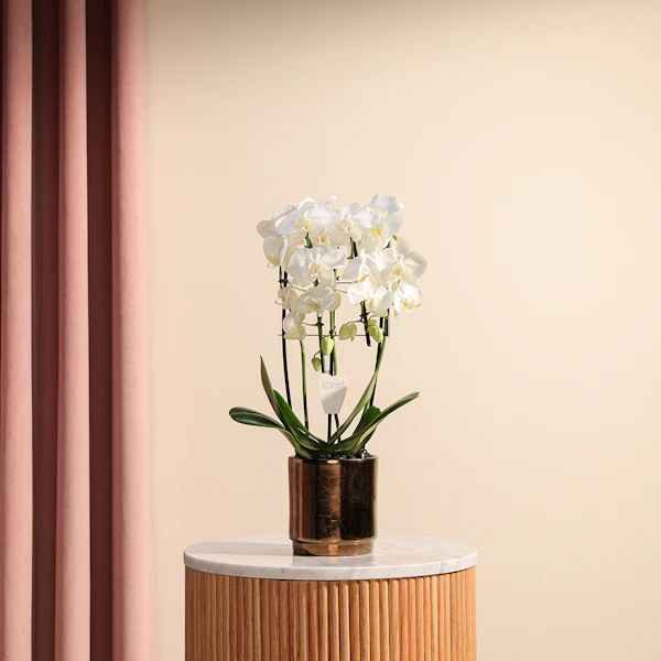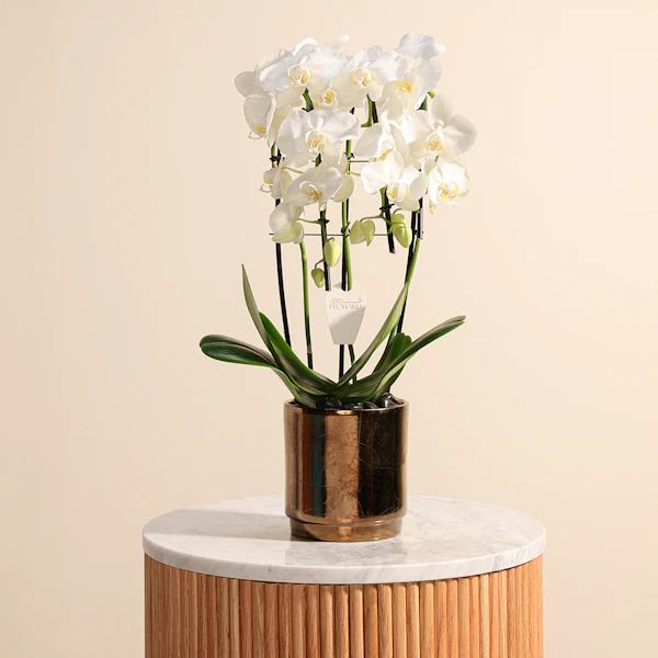Remind your loved ones of how much you love them with this exquisitely unique orchid. A delicate orchid that will take their breath away. An ideal present for a housewarming or office environment. Keep the plant happy by watering it once a week with cold water and keep it a room temperature above 18 °C. Celebrate with sophistication and grace by gifting the White Orchid Plant elegantly displayed in a Golden Vase. This exquisite combination of purity and opulence captures the essence of the celebrations, symbolizing peace, renewal, and blessings. The delicate white orchid, known for its elegance and timeless beauty, shines radiantly against the luxurious golden backdrop, creating a mesmerizing focal point for any space. Whether adorning your home or presented as a thoughtful gesture to loved ones, this stunning arrangement embodies the spirit, spreading joy and harmony throughout the seasons.
