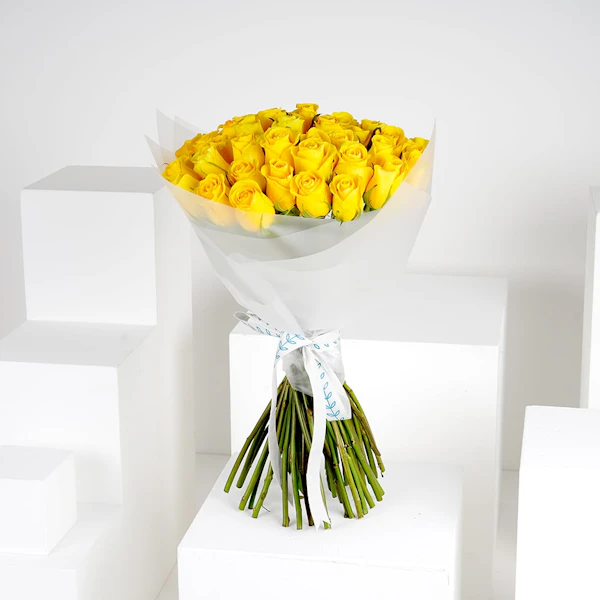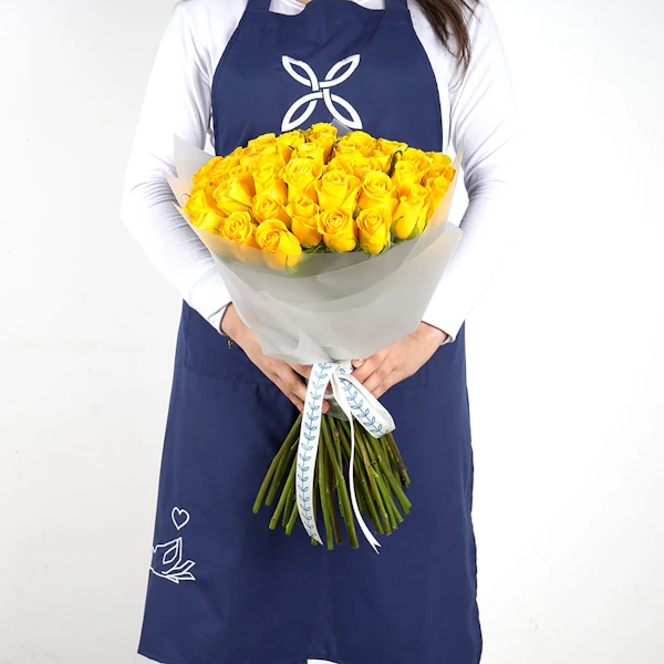 This stunning bouquet features 50 bright yellow roses that are sure to bring joy to your special someone. The vibrant color and sweet fragrance of these blooms will make them feel loved and appreciated. Perfect for birthdays, anniversaries, or any occasion where you want to express your love and admiration. Give the gift of happiness with this gorgeous bouquet of yellow roses.