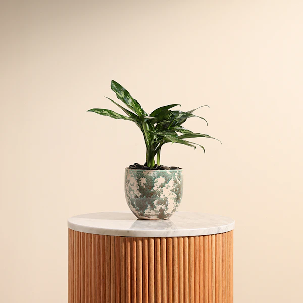 Enhance your living or working space with the elegant Aglaonema plant. This beautifully planted Ceramic Pot brings a touch of natural garden ambiance to any environment, making it a perfect gift for a home or office. Known for its low maintenance, it thrives in various light conditions and only requires watering every 2 to 3 weeks. Ideal for beginners, it also purifies the air and benefits from monthly plant nutrition. Repotting every 3 years keeps it healthy and vibrant. Bring the tranquility of nature indoors with this exquisite Aglaonema plant.