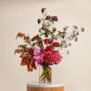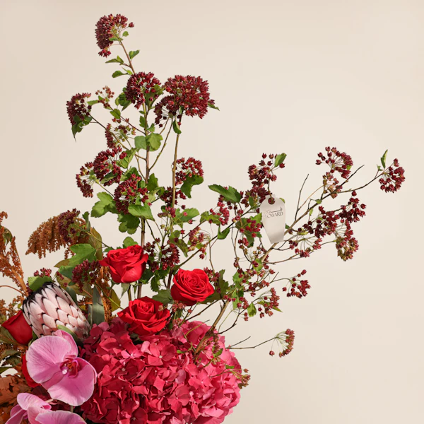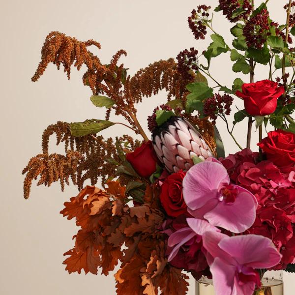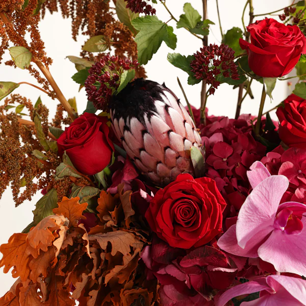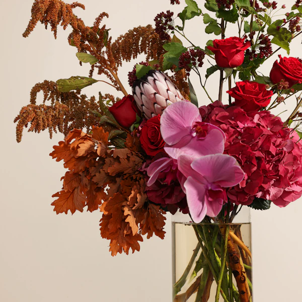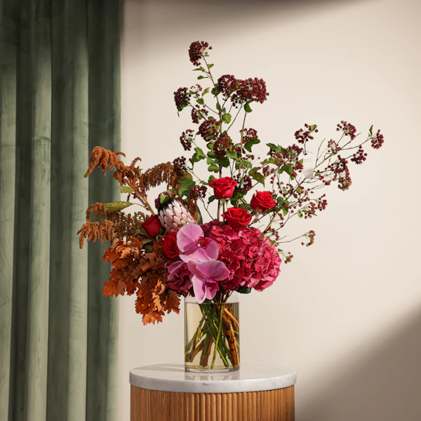 SKU FC59422Delight in the striking beauty of this floral arrangement featuring a Purple Orchid, vibrant Fuchsia Hydrangea, and deep Red Roses, elegantly presented in a sleek cylinder glass vase. This ensemble combines rich hues and contrasting textures, creating a captivating centerpiece that exudes passion and sophistication. Perfect for expressing love, admiration, or celebrating a special occasion with a touch of timeless elegance.