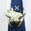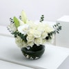 A glass vase filled with white flowers can be a beautiful and simple way to add some elegance to a room or space. White flowers are often associated with purity, innocence, and peace, making them a popular choice for special occasions such as weddings, christenings, or funerals. The transparent nature of the glass vase can allow the beauty of the flowers to shine through and provide a focal point in a room. Additionally, the simple and timeless style of a glass vase filled with white flowers can complement any decor and add a touch of sophistication to any setting.