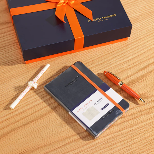 The Campo Marzio Ocean Blue Set includes a Note Book and a pen, beautifully packaged in an elegant box. Ideal for gifting or personal use, this set combines stylish design with practical functionality. Elevate someone’s workspace with the Marzio Ocean Blue Set, featuring a stylish notebook and sleek pen. The rich ocean blue design exudes sophistication, while the high-quality materials ensure a luxurious writing experience. This set makes a thoughtful and practical gift, inspiring productivity and adding a touch of elegance to daily tasks.