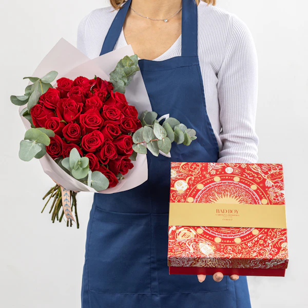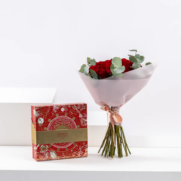 Experience the epitome of love with our Valentine's hand bouquet, showcasing 25 exquisite red roses. Each rose is a testament to passion, meticulously arranged to convey deep emotions. Elevate the celebration with the enticing fragrance of the Carolina Herrera Bad Boy Set, featuring a captivating combination of the Bad Boy Eau de Toilette (100ml) and a Bad Boy Mini. This luxurious bouquet combines the timeless beauty of roses with the bold allure of Bad Boy, creating a truly unforgettable Valentine's Day experience.